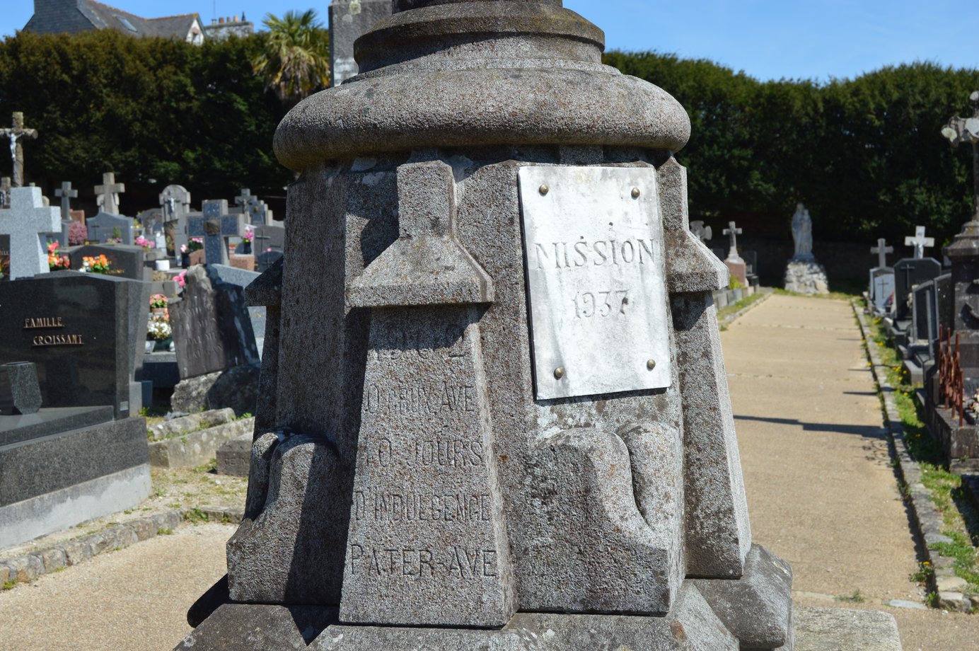 2590. Kerfeunteun, cimetière no 1, g. k. 8 m. 1902. Trois degrés. Socle composite: 1902 0 CRUX AVE 40 JOURS D’INDULGENCE PATER AVE, plaque: MISSION 1937. Fût, écots, chapiteau. Croix, fleurons, crucifix. [YPC 1980]