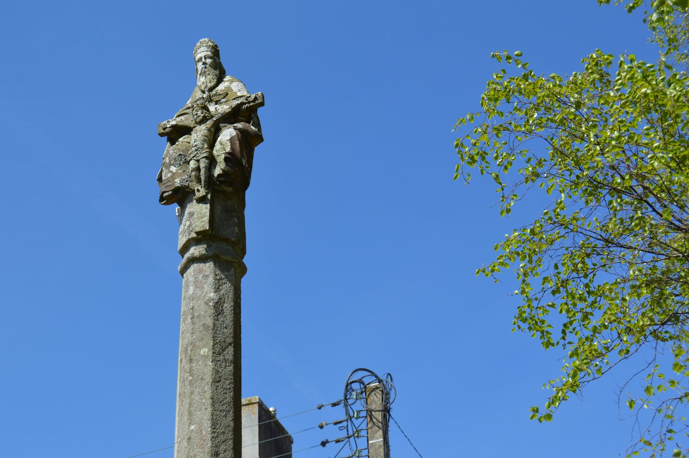 2601. Penhars, Prat-an-Ras, g. 1,30 m. 1804. Sur une base indistincte, croix à pans, crucifix. Vierge à l’Enfant. 1804 GVY LE BRVN ANNE T. Provient de Cléden-Cap-Sizun. [YPC 1980]