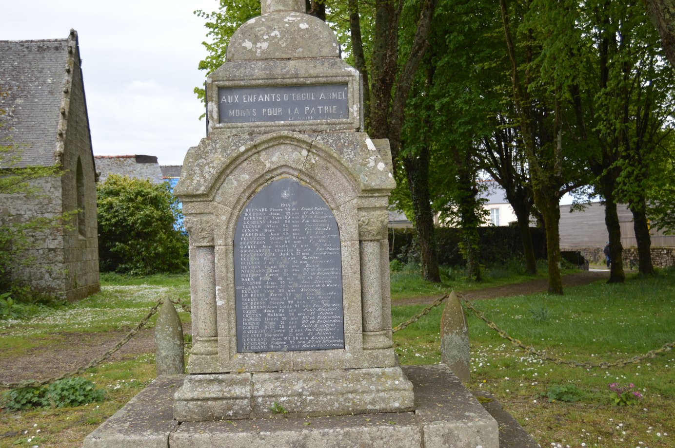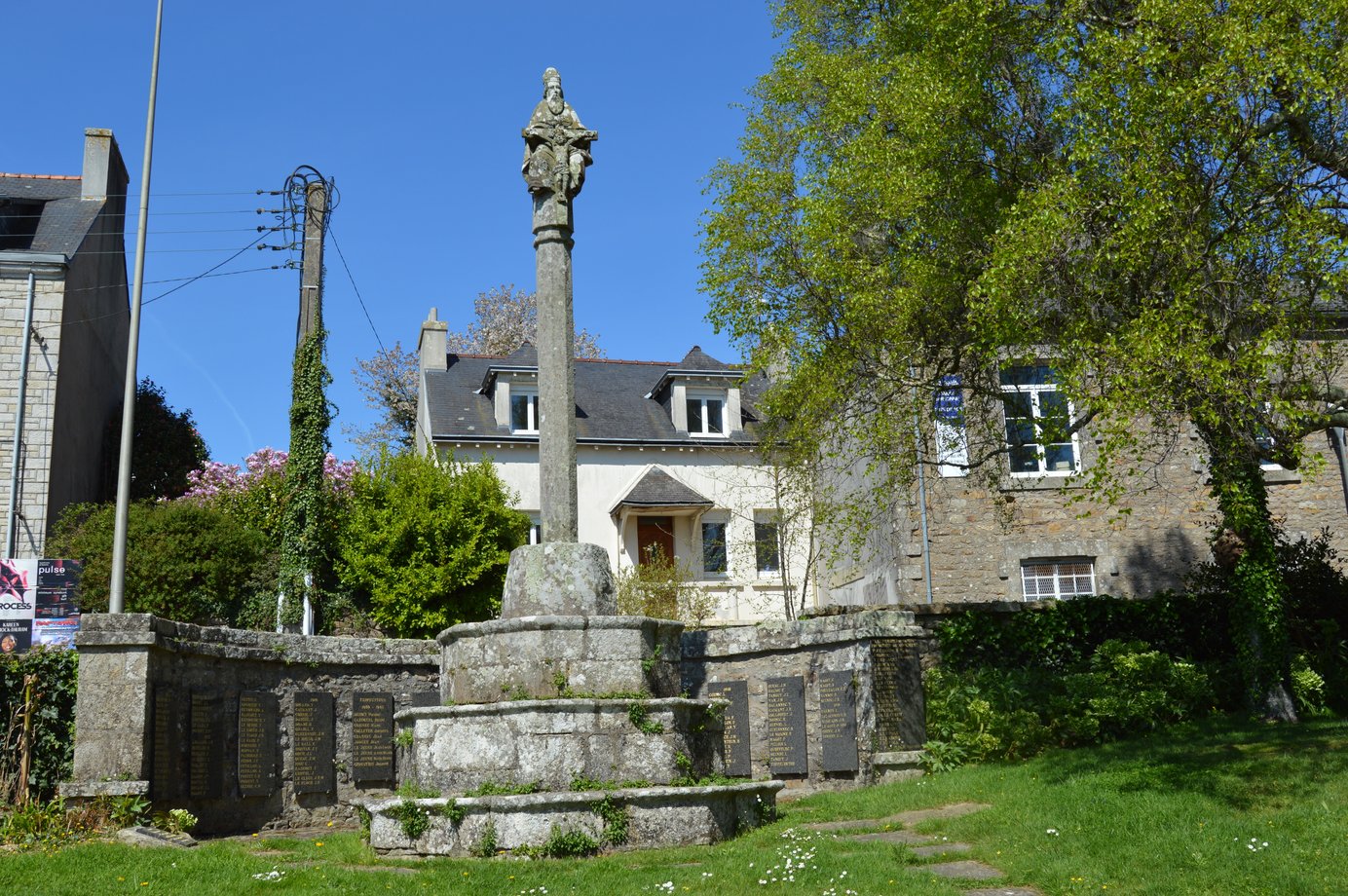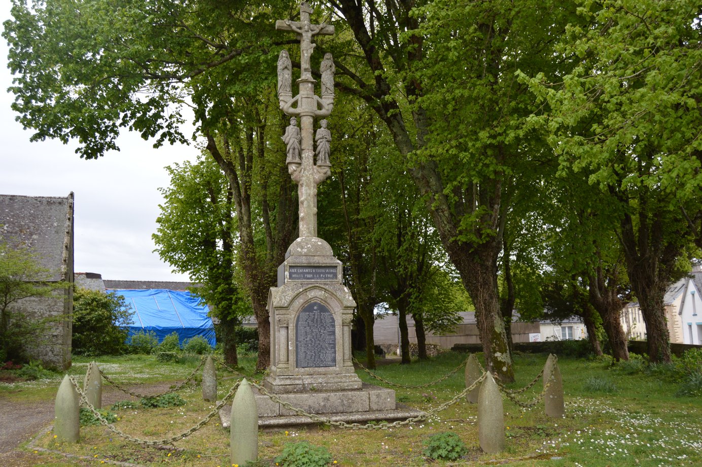 2588. Ergué-Armel, église, g. 6 m. XVIè s. 1921. Deux degrés, corniche. Soubassement moderne, arcatures, colonnes. Socle: AUX ENFANTS DE ERGUE ARMEL MORTS POUR LA PATRIE. 10 JUILLET 1921. LE MAIRE A. FEUNTEUN. Fût, console, marmousets, soldat, marin. Croisillon, Vierge, Jean. Croix de section octogonale, crucifix. [YPC 1980]