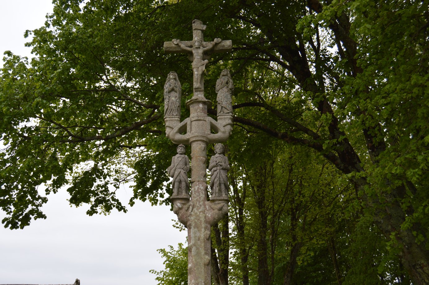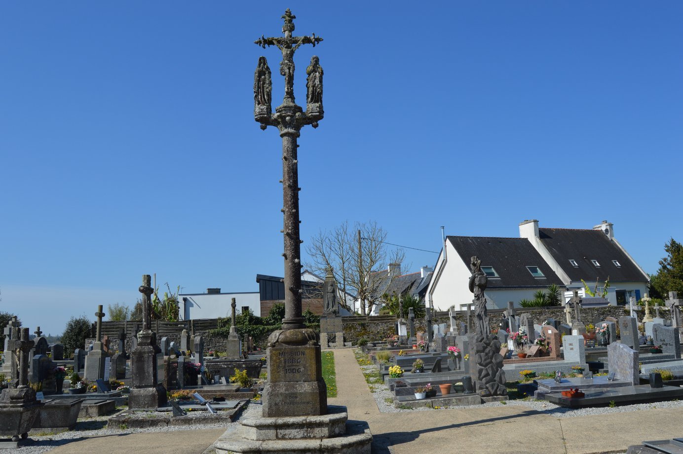 2600. Penhars, cimetière, g. k. 6 m. 1886. Trois degrés. Socle composite. Fût rond, écots. Croisillon, statues: Vierge, Jean. Croix fleuronnée, crucifix. [YPC 1980]