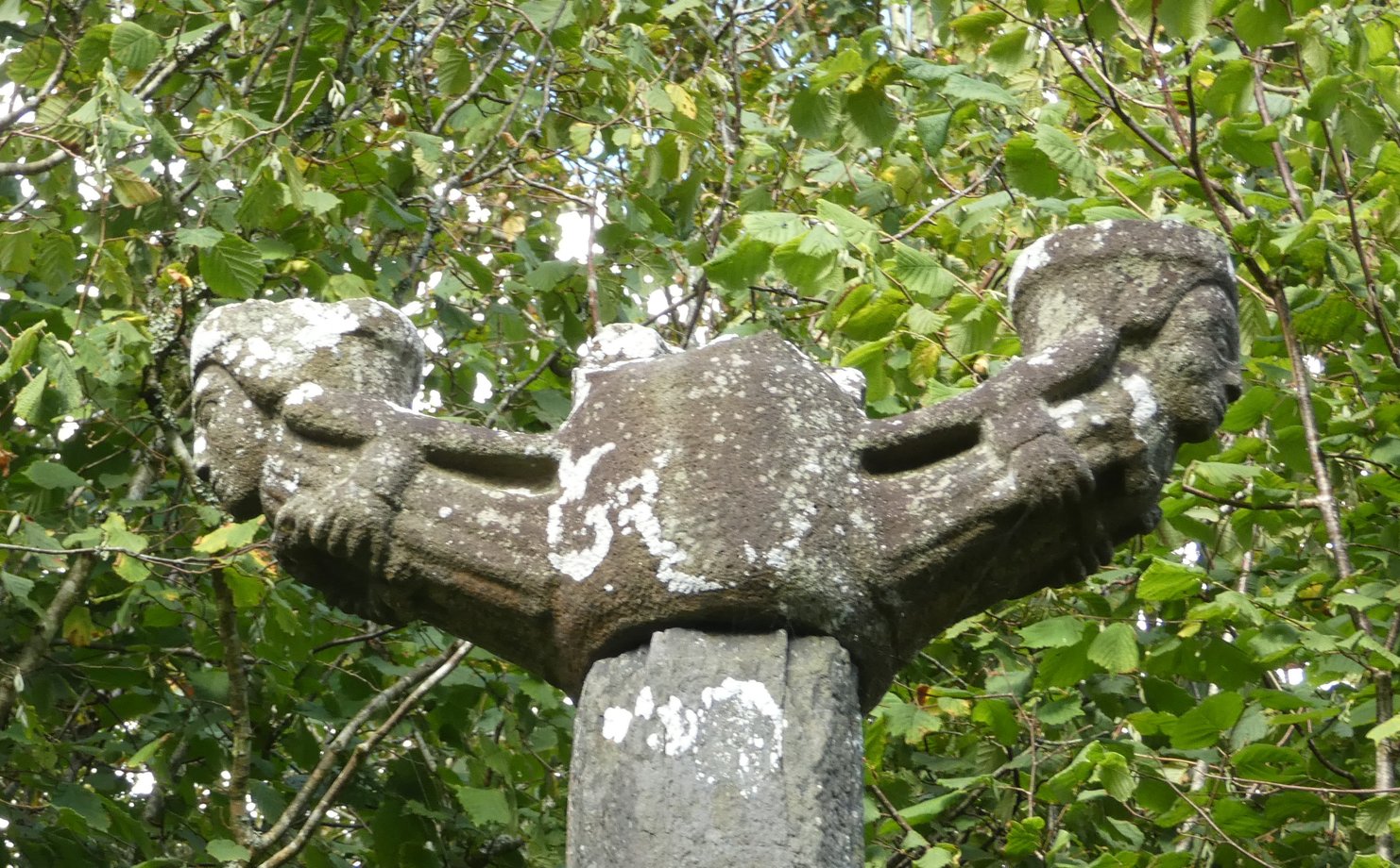 2700. Saint-Eloy, église, g. k. s. 4,50 m. XVè s. Deux degrés. Socle à corniche, sur le plat: IESU. Fût rond. Croix monolithe, croisillon aux personnages formant triades, Vierge-ange-Pierre, Jean-petit personnage-Paul. Croix à fleurons carrés, dais, crucifix, Vierge à l’Enfant, on devine un masque à droite du Christ. [YPC 1980]