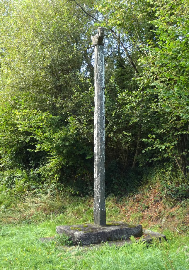 2698. Fresbuzec E, Croas-ar-Méné, s. 3 m. XVIès. Socle carré. Fût. Dressée au carrefour des anciennes voies Le Faou-La Martyre et Saint-Eloy-Logonna, les vestiges de la croix, le croisillon et les statues ont été volés. [YPC 1980]