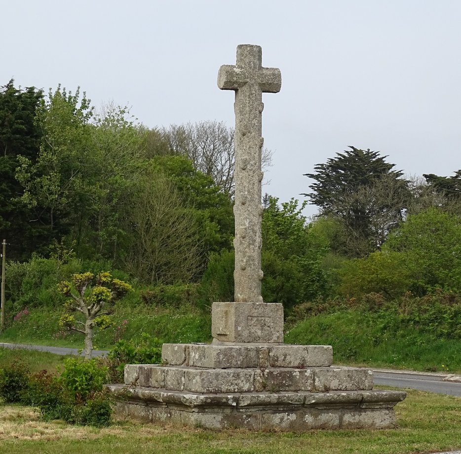 2704. Château-de-Penmarc’h 0 + Croaz-ar-Bleizi, g. 4 m. 1638. Trois degrés en belles pierres de taille, corniche. Socle cubique, à panneaux: 1638. Croix monolithe à pans, hampe ornée de quatre séries de six écots. [YPC 1980]