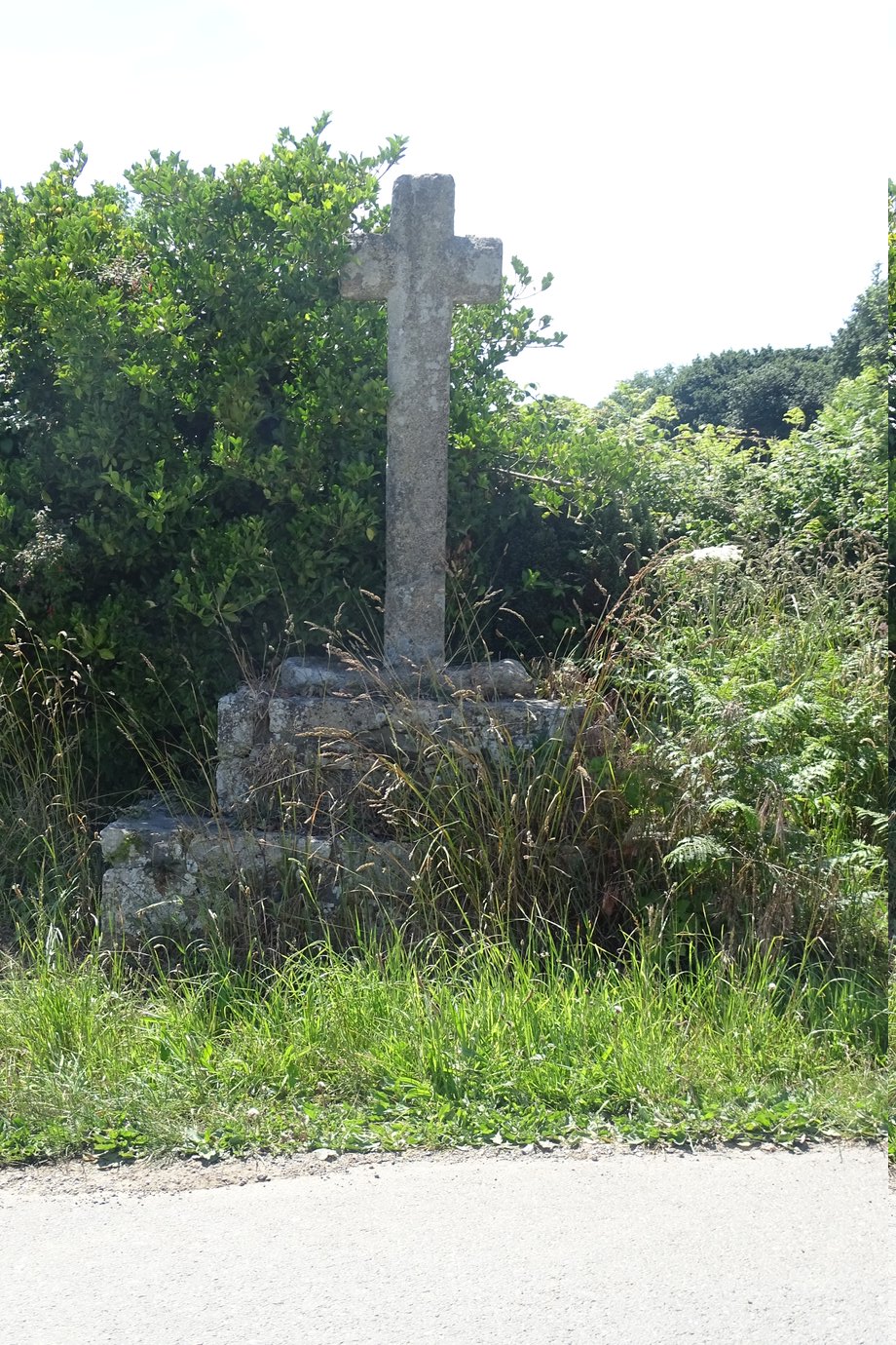 2709. Kerfréoc + Feunteun-Veler, g. 1 m. Soubassement cubique réutilisant des pierres tombales. Croix de section octogonale. [YPC 1980]