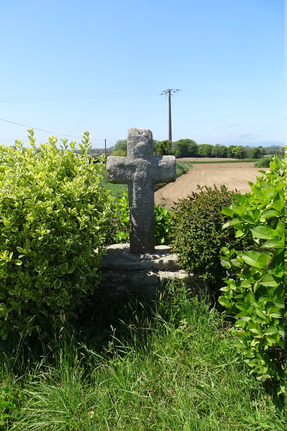 2705. Kerradennec, + g. 1,70 m. XVIè s. Sur un angle de mur, socle cubique, croix à pans. [YPC 1980]