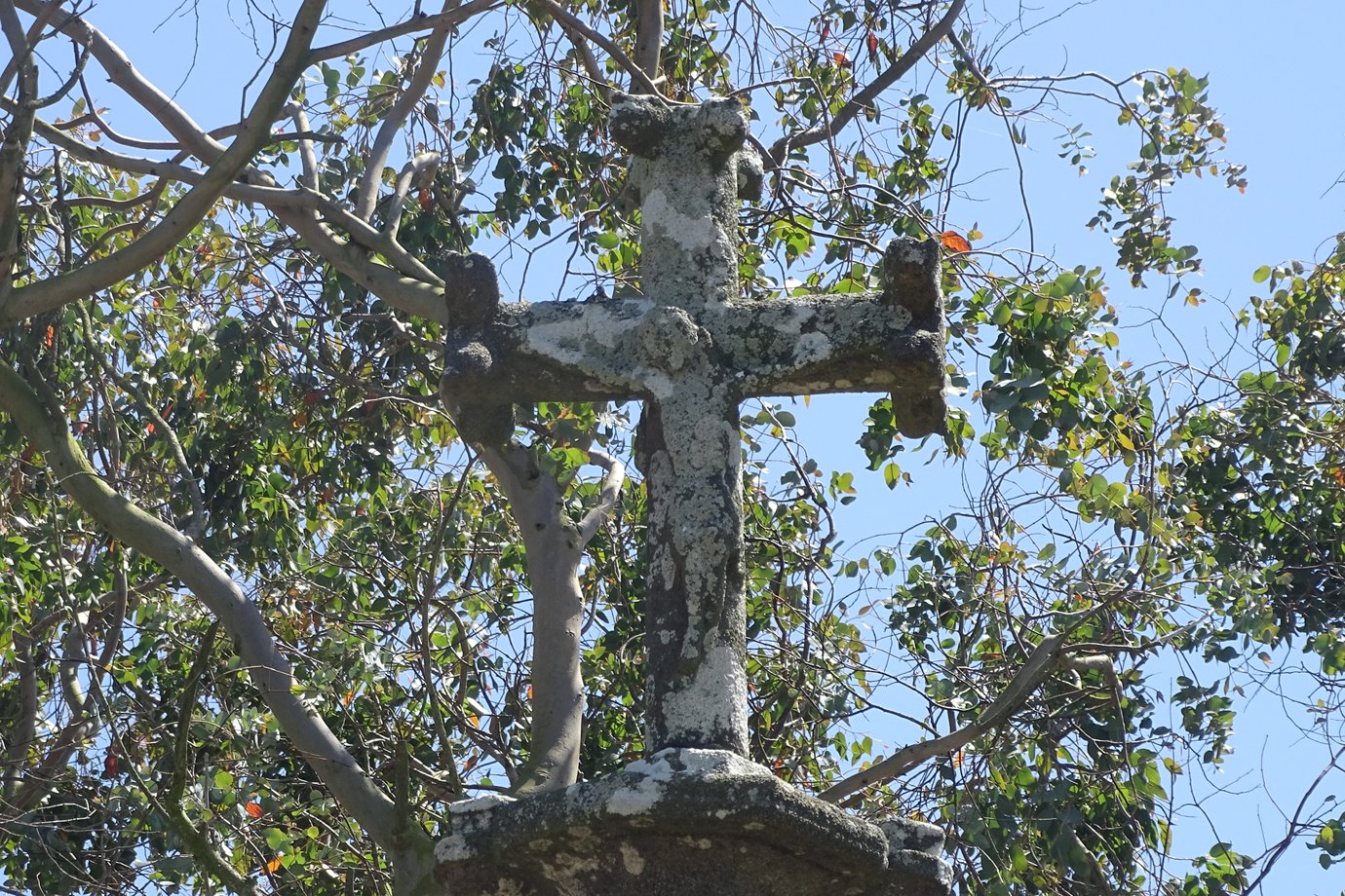 Croix longue avec chanfrein, sur socle à trois marches rectangulaires et une supérieure ovale dans un parterre d´hortensias sous les arbres. Matériau : Granit. [closdesfuchsias 2025]