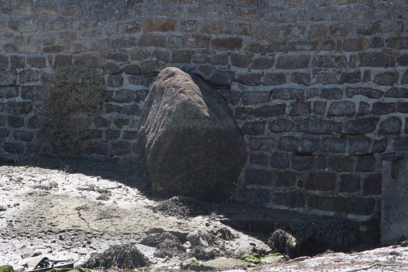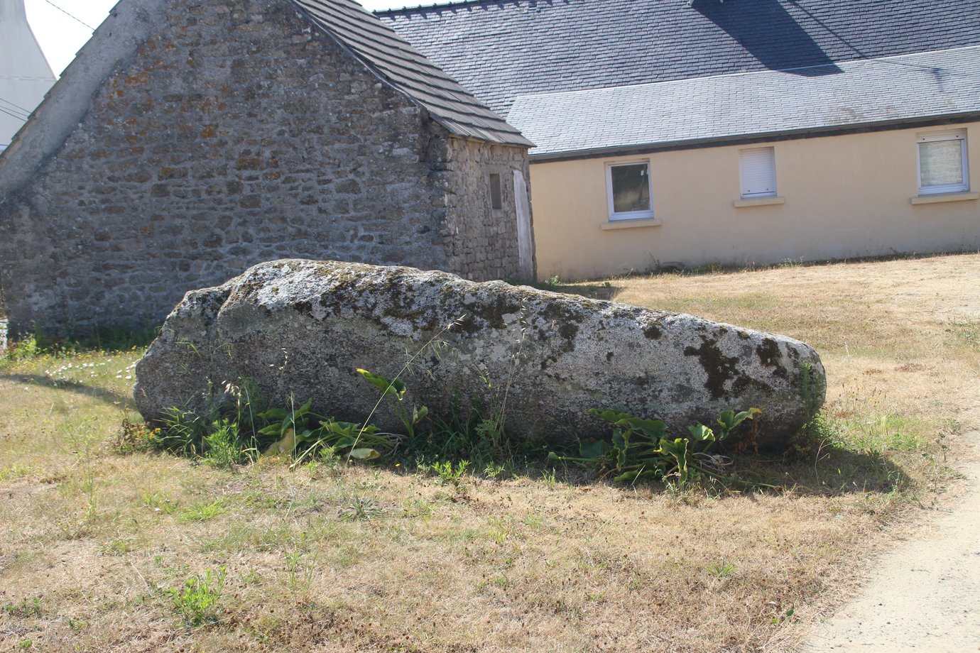 Appelé aussi menhir de Steir Nibilic. Au début du XXe siècle, le menhir de Men Rouz était baigné par la mer et à marée haute ne dépassait que de 0,50 m au-dessus de l´eau. Le commandant Devoir estimait sa hauteur totale à 6,50 m. Il fut momentanément enfoui dans des remblais dans les années 1960, tout comme quelque temps auparavant pour la zone marécageuse à proximité, devenue parking. En 1979, il fut décidé de réduire le comblement du Ster-Nibilig. D´après Jean Folgoas, maire à ce moment-là, lorsque la pelleteuse toucha le menhir, un archéologue fut dépêché sur place, et, après examen de diverses solutions, fut retenu ce que nous voyons aujourd´hui ; le menhir est désormais encastré dans le mur de la digue de l´anse de Steir-Nibilic. (source : Wikipédia). Appellation : Menhir Men Rouz. [andré47 2025]